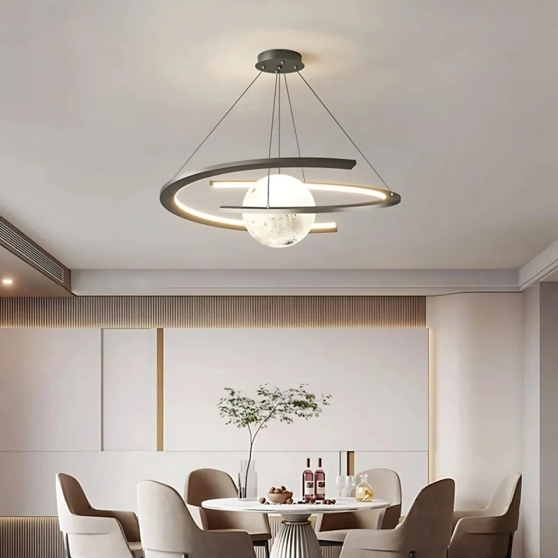 Spiralna konstrukcja lampy nadaje jej lekkości i niepowtarzalnego charakteru. Centralna kula, przypominająca księżyc, otoczona jest świetlnymi pierścieniami, które tworzą wrażenie orbitalnego ruchu. To nowoczesna lampa wisząca przeznaczona dla osób ceniących unikatowy design, estetykę oraz funkcjonalność.