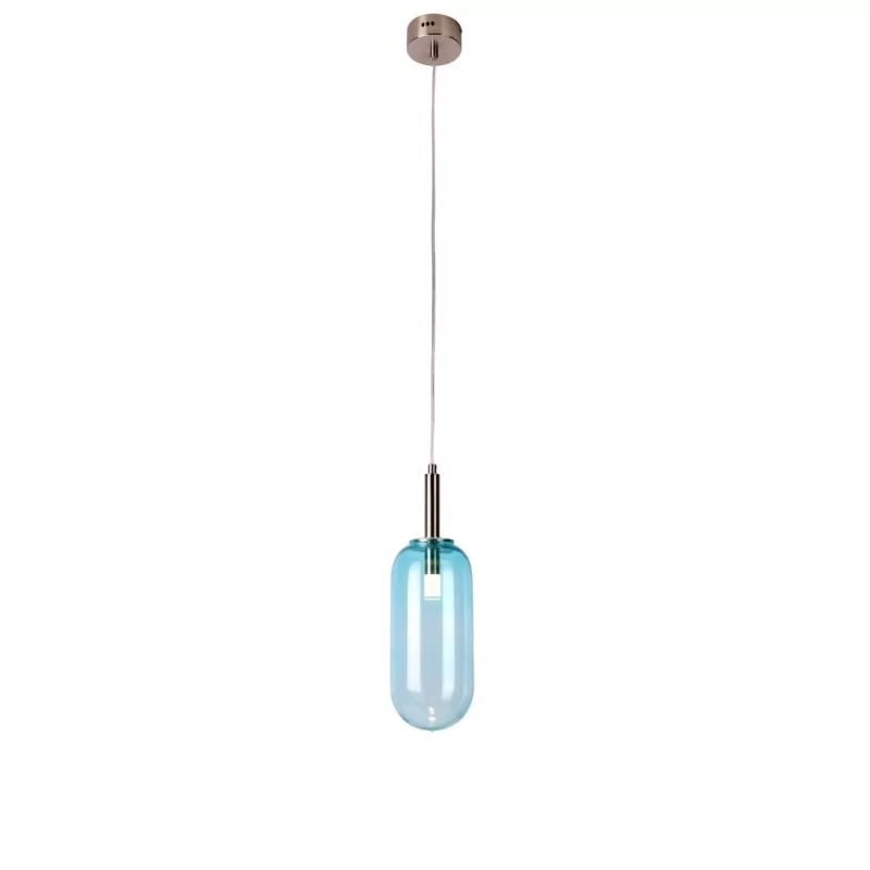 Seria szklanych lamp w cylindrycznym kształce ze zintegrowanym źródłem światła LED. Wyjątkowy charakter serii nadaje eleganckie, kolorowowe szkło. Produkt doskonale wkomponuje się w nowoczesne wnętrza i pomieszczenia takie jak salon, sypialnia, gabinet, pokój dziecięcy. Wyjątkowy efekt można osiągnąć zestawiając kilka lamp ze sobą. Lampa wisząca w kolorze niebieskim z jednym punktem świetlnym.