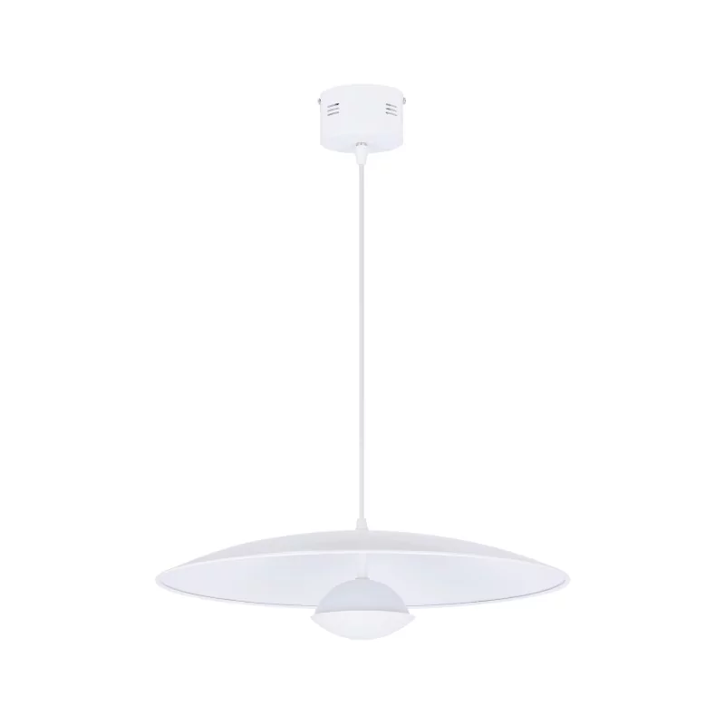 Seria czterech lamp o nowoczesnym kształcie insporowane stylistyką skandynawską. Eleganckie lampy wykonane z białego metalu ze zintegrowanym źródłem światła LED o ciepłej barwie. Doskonale nadają się do salonu, jadalni, kuchni, gabinetu oraz sypialni. Lampa wisząca o średnicy 48 cm.