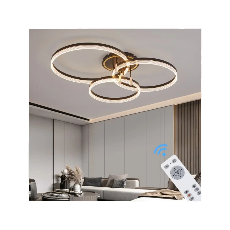 Nowoczesna Lampa sufitrowa LEDw eleganckim wykończeniu czarno–złotym to połączenie wyjątkowego designu, energooszczędnej technologii LED oraz funkcjonalności sterowania zdalnego. Dzięki możliwości płynnej regulacji barwy światła oraz natężenia za pomocą pilota lub aplikacji na telefonie, lampa oferuje pełną personalizację oświetlenia w każdym pomieszczeniu.
